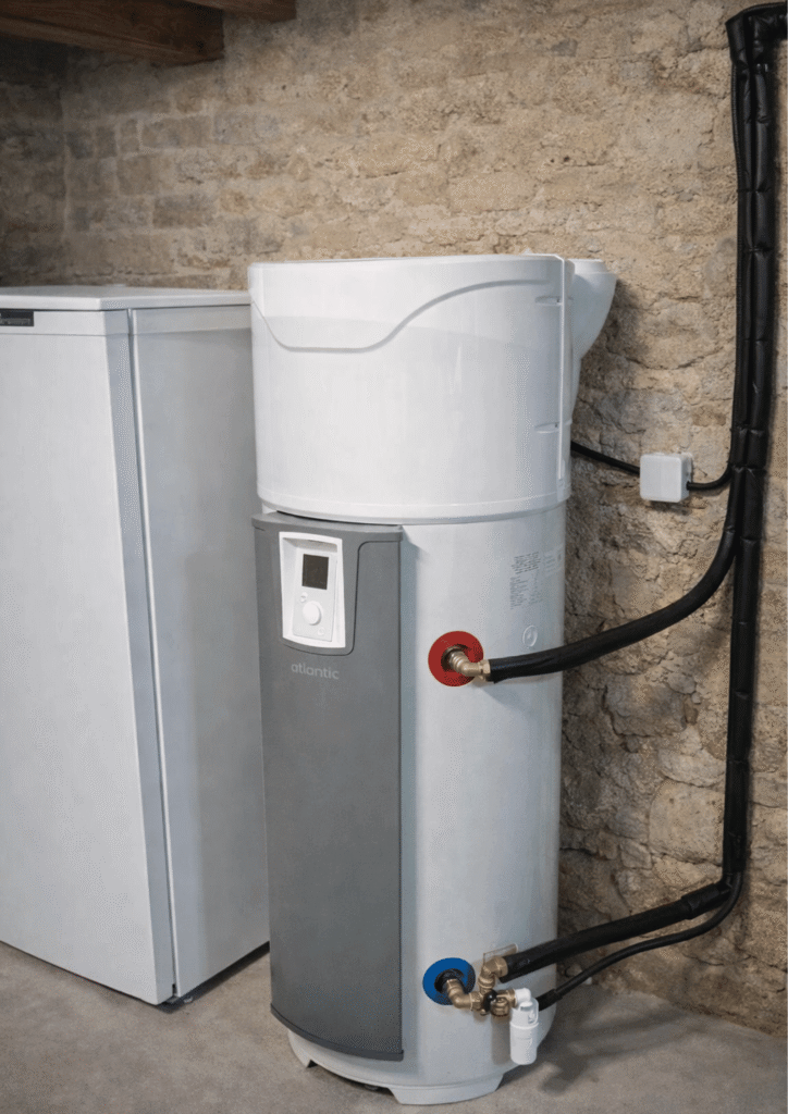 Côté chauffagiste, le chauffe-eau thermodynamique à air extérieur se pose avec une pompe à chaleur intégrée au ballon : la captation des calories de l’air extérieur via des gaines alimente la production et stockage de l’eau chaude sanitaire, avec indépendance vis-à-vis de l’air intérieur et un fonctionnement stable quelle que soit la configuration du logement.